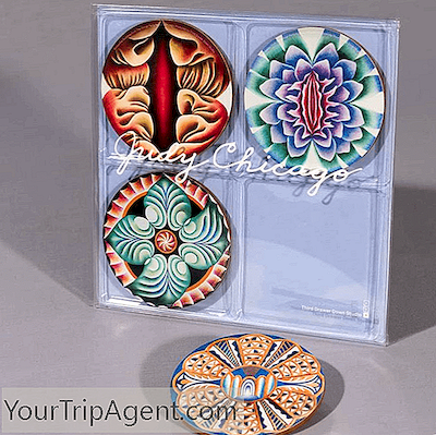 Questo set di sottobicchieri in sughero prodotto da Through the Flower, l'organizzazione artistica senza scopo di lucro di Judy Chicago, si basa sul design delle lastre della famosa installazione dell'artista americana, The Dinner Party (1974-79) è ora ospitato permanentemente al Brooklyn Art Museum. Rappresentando diverse donne nella storia, ogni sottobicchiere proviene da uno dei quattro piani di piastre su 39 tavole e rappresenta: Dea primordiale, Saffo, Isabella d'Este, Ipazia.